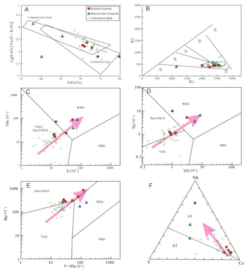 The granites at Xingshuping and most previous granite data from the Wuduoshan pluton are mainly plotted in the common area between the compression and extension field (Figure 15A), but the trends suggest that, with the evolution of magma, the crust gradually transited from compression to extension. In the R1 versus R2 tectonic discrimination diagram (Figure 15B), the samples mainly fall within the fields of syn-collision, minor samples plot in anorogenic to post orogenic domains. The biotite granites and most literature data are mainly plotted in the syn-collision granites (Syn-COLG) and volcanic arc granite (VAG) domains and minorly plotted in the within plate granite (WPG) domain, whereas the monzonitic granites mainly fall in the WPG domain on tectonic discrimination diagrams (Figure 15C–E). This is consistent with magma that originated from partial melting of continental crust in an extensional setting []. Moreover, the trends exhibited from VAG to Syn-COLG and then to WPG domains are consistent with the trend of increasing extension. In the Nb-Y-Ce diagram [] (Figure 15F), all the samples have a trend plot from the post-orogenic A-type granite (A2) domain to the anorogenic A-type granite (A1) domain. To summarize, the biotite granites from Xingshuping were mainly formed in a Syn-COLG extension setting, whereas the monzonitic granites mainly formed in an intraplate transformed from compression to extension setting. The geochemical and isotopic differences between the two kind granites at Xingshuping were likely caused not only by the variable composition of the mixed source and evolution processes but also by the transformation tectonic environment.