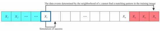 As the spatial distribution of geochemical elements has a complex variation of characteristics, in the initial stage of random simulation, the distribution of conditional data is sparse, which makes the neighborhood of data events larger. As a result, it may be impossible to find a pattern matching the current simulated position data events in the entire training image. If the lowest distance is accepted and its value is assigned to the center node, the inconsistency will be further spread as the simulation continues. Therefore, this study attempted to add the index value of the current simulation location to the end of the simulation path and freeze it when this unmatched pattern is encountered. As shown in Figure 1, after all the nodes are simulated, the simulation points that cannot match the model in the first round of the simulation are thawed, and these nodes are then simulated in order. If there is still a node that cannot find a matching pattern, the node with the lowest distance is accepted, and its value is assigned to the center node.