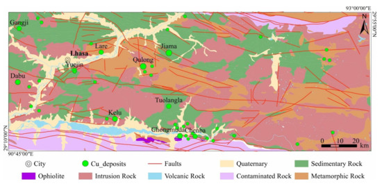 The study area, the so-called ”Mila Mountain Integrated Exploration Region”, is located in the eastern Gangdese metallogenic belt in Tibet, southwest China (29°10′ N–29°55′ N; 90°45′ E–93°00′ E), with an area of about 12,290 km2, which is one of the most famous copper mineralization areas in Tibet [39,40,41,42] (Figure 2). The subduction of the Neo-Tethyan Oceanic crust beneath the Asian plate from the Jurassic to the Cretaceous period and the subsequent collision of Indian–Asian plates in the Paleocene period and post-collisional magmatism in the Miocene period formed the specifically geological background and metallogenic conditions [43,44]. Mineralization is associated with the post-collisional small-volume intrusions, which intruded both pre- and syn-collisional granitic batholiths and the earlier stratigraphic volcano-sedimentary sequences [44,45,46,47,48]. Sedimentary rocks include clay stone, sandstone, shale, lithic sandstone, mudstone, and limestone from the Paleozoic to Cenozoic periods, and most of the outcrop sedimentary rocks are from the Cenozoic period. There have been intense intrusion activities in the past geological periods, especially in Mesozoic and Cenozoic. Intrusions that crop out at the surface in this area are mainly intermediate-acid intrusive rocks, and are controlled by the orientations of structures. The main faults have E–W, N–E, and N–S orientations. The fault systems control the mineralization and distribution of mineral deposits in the study area. The E–W-oriented faults control the distribution of copper deposits, and the faults with N–E and N–S orientations provide favorable conditions for Cu, Mo, Au, Pb, Zn, and other metal deposits [49] (Figure 2).