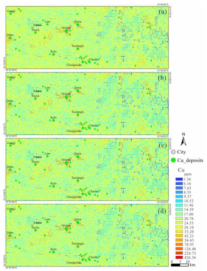 When comparing the results among simulation-based LSA (Figure 9a), kriging interpolation (Figure 10a), and kriging interpolation-based LSA (Figure 10b), a similar distribution of Cu is shown in macroscopy, but the smooth effect is clear in Figure 10. Comparatively speaking, as the original data were honored and the mean singularity was represented, the simulation-based LSA has a more powerful ability to reflect geochemical distribution patterns.