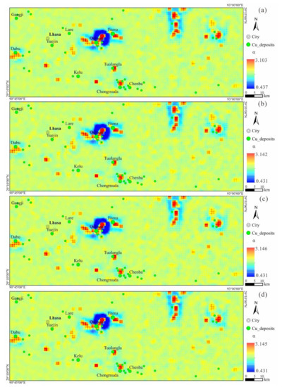 The E-type α method measures the mean value or trend of the singularity (Figure 9a). It can be seen that the E-type α map can better show the continuity of spatial distribution patterns. The E-type α variance can express the variety of the uncertainty where the maximum predicted variance means the maximum uncertainty, and vice versa (Figure 9b). The locations near the edge have a higher uncertainty, which may be caused by the limited values involved in the LSA estimation [14].