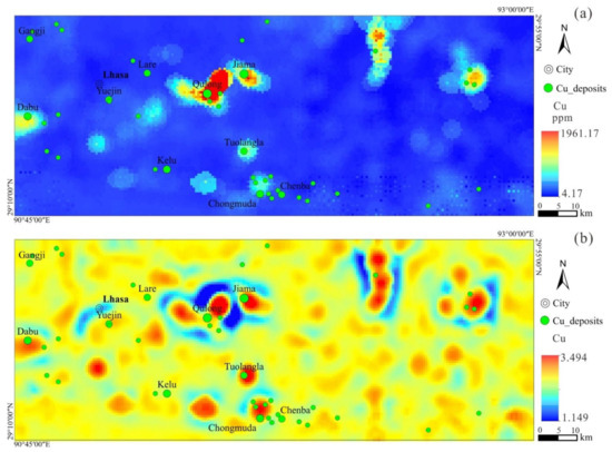 (a) The distribution of Cu by ordinary kriging and (b) the kriging interpolation-based LSA.