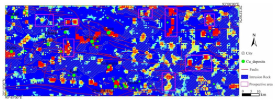Uncertainty of the target attribute can be expressed as a probability map determined by a certain threshold [13,54]. Based on the singularity index map and the thresholds (α < 1.943) obtained in Section 4.2, the anomaly probability of Cu element can be calculated by the equation in Section 2.3. The anomaly probability map shows a close relationship between the high anomaly probability areas and known copper deposits (Figure 12). In fact, the high anomaly probability area always occurs on the edge of intermediate-acid intrusions or on the side of faults, which are the favorable metallogenic areas in this study region. Furthermore, combining the geological background and the favorable metallogenic conditions in the study area, such as intermediate-acid intrusions, intersection of faults, and favorable sedimentary rocks, several preliminary mineral prospective targets are proposed in Figure 13.