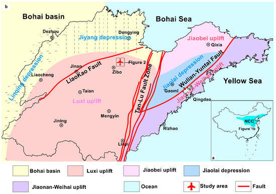 The study area is located at the Luxi uplift (also called western Shandong uplift) of the northeastern North China Craton (NCC). The NCC is a main tectonic unit of the Chinese mainland with a history of 3.8 billion years. It is mainly bounded by three orogenic belts. The north and southwest boundaries are, respectively, the Inner Mongolia-Daxinganling orogen and the Qinling-Dabie orogen, and the southeast boundary is the Su-Lu orogen [37,38,39]. (Figure 1a)