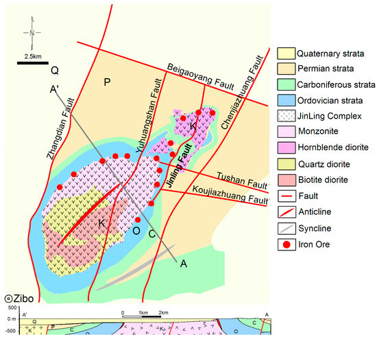 The study area, JIOC, as mentioned above, is several kilometres away from the northeast of Zibo city. The strata of the JIOC from old to new are Ordovician (O), Carboniferous (C), Permian (P) and Quaternary (Q). The Ordovician strata are mainly carbonate of the Majiagou Group, with an overall thickness of 700–800 m, of which the most closely related to mineralization is relatively pure limestone. The Carboniferous strata mainly consist of iron–alumina mudstone and fine sandstone, with a thickness of about 400 m. The Permian strata mainly consist of sand shale and thin layer limestone, with a total thickness of about 500 m. The flood and slope deposits of the Quaternary, mainly yellow silt clay, silt clay and silt clay, with a thickness of 60–200 m, are widely distributed (Figure 2).