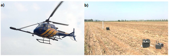 An overview of the aeromagnetic survey system. (a) The AS-350 B3 helicopter with a stinger taking off. (b) The BaseMag was placed nearby in the fields.