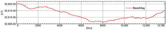 Diurnal magnetic Correction (DMC) or BaseMag Correction (BMC) is used to eliminate the influence of periodic daily variation and short-term disturbance of the geomagnetic field [48,49]. The BaseMag Station (BMS) is generally placed nearby the survey area where the magnetic field is stable (Figure 7). In this survey, the BMS was located on a farm between the survey area and the landing point. The DMM and aeromagnetic were both set sampling rates at 10Hz. The DMC was computed point by point according to GPS time.