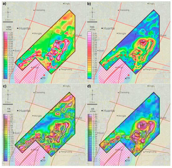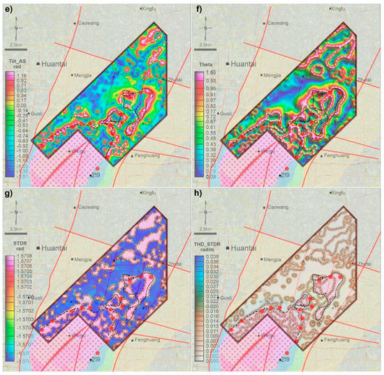 Figure 9 shows the results from applying the boundary enhancement and edge detection methods including VDR, THD, Tilt, AS, Tilt_AS, Theta map, STDR and THD_STDR to the measured HRAM data from the JC area. Compared with TMI and RTP (Figure 8), these figures show that the range of aeromagnetic anomalies over the JC have been significantly narrowed and subdivided into smaller ones, and all applied methods have produced their effects. According to the different algorithms, VDR (Figure 9a), Tilt (Figure 9c) and STDR (Figure 9g) use their zero lines (white dashed line in the figures) as the boundaries of the magnetic anomaly. Meanwhile, THD (Figure 9b), AS (Figure 9d), Tilt_AS (Figure 9e), Theta map(Figure 9f) and THD_STDR (Figure 9h) are represented by their maximum values (white dashed lines in the figures).