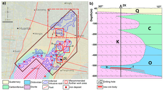 According to previous studies, the JC was formed by magma intruding from the north-east to south-west along with the fracture structures, with the intrusion becoming progressively shallower in depth [34]. Figure 10a shows the inferred distribution (blue dots area) of the rocks based on the newly measured HRAM data. The contact zones between the JC and the surrounding strata control the morphology of the iron ore bodies and indicate favourable locations for mineralisation. Therefore, we recommend several deep prospective areas in the outer edge of the inferred NJC internal minor rock bodies (zones 1–3 in Figure 10a) and the inferred deep intrusive rock zone in the northern part of the study area (zones 4–5 in Figure 10a). Deep exploration is suggested for implementation in zones 1–3 as a priority, as they are located within the JIOC. Zones 4–5 are the inferred concealed rocks areas that have not been previously investigated, therefore it is recommended that prospecting should first be carried out in Zone 4 and then enlarged to Zone 5 after some progress has been made.