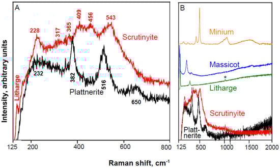 Raman spectra of the lead oxide minerals most frequently occurring in lead-pipe scale. (A) Black spectrum of plattnerite (synthetic); red spectrum of scrutinyite (from pipe scale). One diagnostic peak for litharge (far left) indicates this mineral as a minor contaminant in scrutinyite. (B) Raman spectra (not to same intensity scale) of PbO2 polymorphs plattnerite and scrutinyite, PbO polymorphs litharge and massicot, and mixed-valence minium Pb3O4. * indicates presence of small amount of lead carbonate.