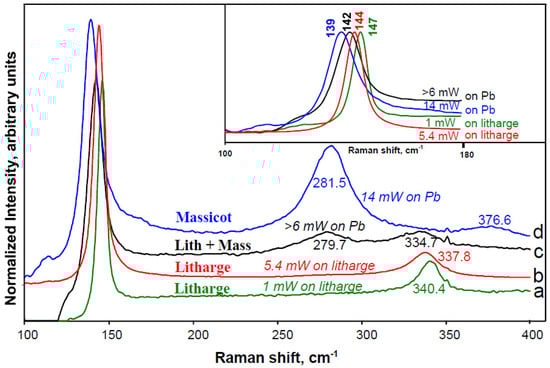 Comparison of Raman spectra taken on clean lead or on a litharge layer on lead using different laser intensities, as measured at the sample surface (further acquisition details are in SI Section S2). Spectra: (a) Litharge formed as an oxidation product on an air-weathered lead ingot; 1 mW laser power. (b) Litharge corrosion on lead pipe harvested from Providence, RI; 5.4 mW laser power. (c) >6 mW laser power on a clean ingot of lead, producing litharge and massicot (both PbO). (d) 14 mW laser power on clean lead, producing massicot. Downshifting and broadening of “340.4 cm−1 peak” of litharge due laser heating (a,b,c). Inset: Spectral downshifting effect on the “147 cm−1 peak” of opaque litharge due to laser heating and formation of massicot (139.3 cm−1).