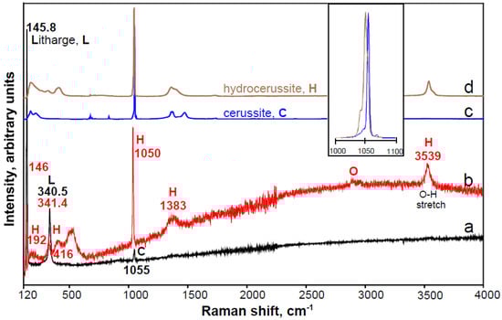In studies of lead-pipe scale, not only the lead oxide but also the lead carbonate minerals cerussite (PbCO3) and hydrocerussite [Pb3(CO3)2(OH)2] are distinguishable by RS. In the latter, this is shown by the peak position of their dominant ν1 C-O bands, with cerussite at ~1055 and hydrocerussite at ~1050 cm−1, as well as by their weaker bands (see Figure 4). If the signal is strong enough and the luminescence (seen as a rising background in spectra a and b) is not too great at higher wavenumbers, not only the C-O band at ~1050 cm−1 is detected for hydrocerussite, but also its O-H stretch at ~3539 cm−1 (Figure 4). The stabilities of these two carbonate phases reflect differences in pH conditions, so the ability to distinguish them provides useful information.