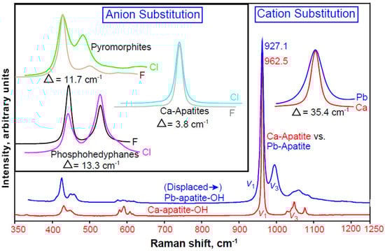 Raman spectra for pairs of Ca-apatite, pyromorphite, and phosphohedyphane OH, F, or Cl species. These examples illustrate the “apatite spectral template” (see two stacked spectra at the bottom of the figure) and the “spectral peak shifts” in response to anion or cation substitution. The relative peak positions (i.e., spectral fingerprints) within the OH-pyromorphite and OH-apatite species are very similar, as illustrated at the bottom of the figure, where the Pb-apatite spectrum has been artificially upshifted to overlay that of the Ca-apatite. The anion- and cation-substitution panels indicate how much spectral shifting is necessary to bring one species into superposition on the other. These shifts (listed as Δ values) in the ν1 or the ν1 + ν3 bands indicate the different spectral sensitivities to cation or anion substitution, illustrating the especially high sensitivity of the lead-bearing phosphates.