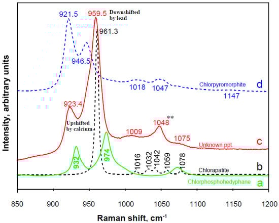 An example pertinent to the analysis of lead-pipe scale is the ability to distinguish between chlorpyromorphite and hydroxylpyromorphite []. The Ksp of the former is about seven orders of magnitude less than that of the latter [,], although it is the hydroxyl member that is usually identified in lead pipes. The XRD distinction is typically based on the presence of a single vs. a double-peak at about 30° 2Θ [] and/or the presence of two vs. three peaks in the 45–47° 2Θ region [] for hydroxyl- vs. chlorpyromorphite, respectively. However, structural incorporation of carbonate in chlorpyromorphite or other mechanisms for lessening the degree of crystallinity in the solid can cause the apparent loss of one peak for chlorpyromorphite in each of those two spectral regions, making its XRD pattern difficult to distinguish from that of hydroxylpyromorphite (see Sternlieb et al. (2010) [], their Figure 2 and Figure 3). Raman spectra in Figure 5 demonstrate more clearly the distinction between these two species of pyromorphite. The spectral distinction remains just as clear in the presence of significant carbonate substitution within the pyromorphite structure (Sternlieb et al., 2010 [], their Figures 6 and 8).