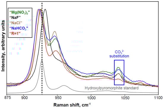 A separate synthesis study [] provided a test for distinguishing between the adsorption (less stable sequestration) of cations onto pyromorphite particles and the structural/crystallographic incorporation (more stable sequestration) of such ions into the pyromorphite structure. RS was done on precipitates from aqueous solutions with total P/Pb molar ratios of 1 and 100 and to which the cations Ca2+, Mg2+, or Na+ (in the form of soluble fluorides, chlorides, bicarbonates, or nitrates) had been individually added. Synchrotron-based, grazing-incidence wide-angle X-ray scattering (GIWAXS) analysis could not definitively distinguish between hydroxylpyromorphite and chlorpyromorphite in the filtered precipitates of the mostly sub-micrometer to nanometer-scale particles []. The presence of different cations and anions, however, clearly affected the Raman spectra of individual, micrometer-scale particles of the phosphate precipitates (Figure 8), i.e., confirming solid solution (structural incorporation of ions) rather than only simple adsorption. A comparison of these spectra with those taken on synthetic pyromorphites of a wide range of known compositions [,] enables the interpretation of the pyromorphite precipitates with regard to anionic substitution of OH−, Cl−, F−, and CO32− (see Figure S3 for details). Such compositional variations affect mineral solubility [,,].