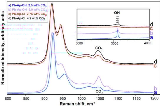 Raman spectroscopy cannot definitively identify single atoms or monatomic ions, but only demonstrate their effects on the vibrational modes of covalent bonds in the mineral, as seen in shifts in peak positions in Figure 6 and Figure 8. However, polyatomic ions exhibiting covalent bonding, such as OH− and CO32−, can be identified unambiguously. This accounts for the appearance in the Raman spectra of specifically identifiable peaks for those two species (Figure 8 and Figure S3). According to comparisons with our pyromorphite standards (e.g., see Figure 9), Zhao et al.’s (2018) [] precipitates in some cases contained as much as 3–4 wt.% CO3 in solid solution. Figure 9 also illustrates the usefulness of calibration standards, using compounds/minerals of well-known composition and structure, for purposes of interpreting more quantitatively the spectra of unknown samples (Figure S3).