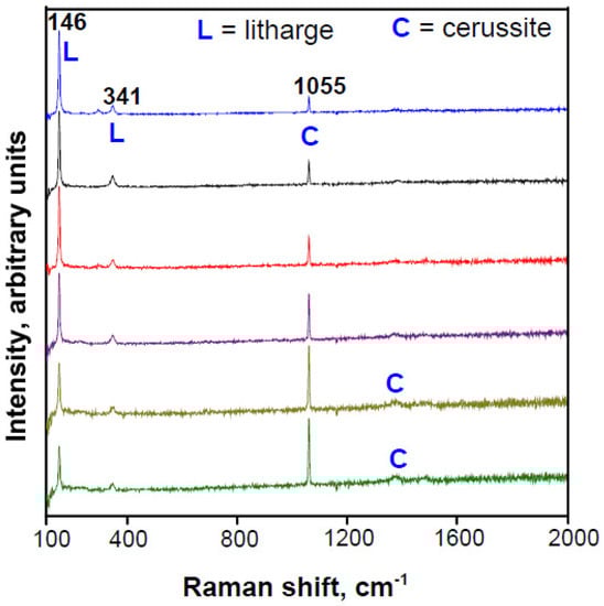 The spectroscopic recognition and quantification of minor changes in mineral chemistry (through shifts in peak position) are of importance in gaining more information from Raman spectra. Samples of known atomic ratios of the elements in question could be synthesized in order to use them as Raman calibration standards (e.g., Sternlieb et al. (2010) [] on the carbonate concentration in pyromorphite; Breitenfeld et al. (2018) [] on the Fe/(Fe + Mg) ratio in the olivine silicate mineral group). Analogous structural standards, using TEM and XRD for independent analysis, could be developed to define the degree of crystallinity of a particular phase, such as litharge (as done for the degree of crystallinity of carbonaceous materials, e.g., [,]; see Figure S7).