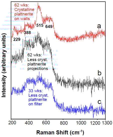 Raman spectra can also reveal variations in crystallinity of the same scale mineral. As seen in Figure 11, fine-grained plattnerite on the walls of lead pipes after 62 weeks of conditioning with Washington, D.C.-synthetic water [] shows a moderate degree of crystallinity, with definable and reproducible peaks (spectrum a). Still recognizable as plattnerite, but showing less well-defined peaks, is the spectrum of sub-millimeter particles captured on filters in the same lead pipes after only 33 weeks of conditioning (Figure 11, spectrum c). The latter material clearly is less well crystalline than that in spectrum (a). In fact, the 33-week filtered particles (c) have a spectrum almost identical to that of the most recently precipitated scale in the 62-week pipe (Figure 11, spectrum b), i.e., fragile material that resides on thin projections protruding from the plattnerite layer on the pipe wall. The fact that type (b) material directly overlies type (a) suggests that the spectra have captured plattnerite in the process of maturation from recent precipitate (b) into a more ordered, more stable crystalline solid (a) as it grows outward from the pipe wall over time.