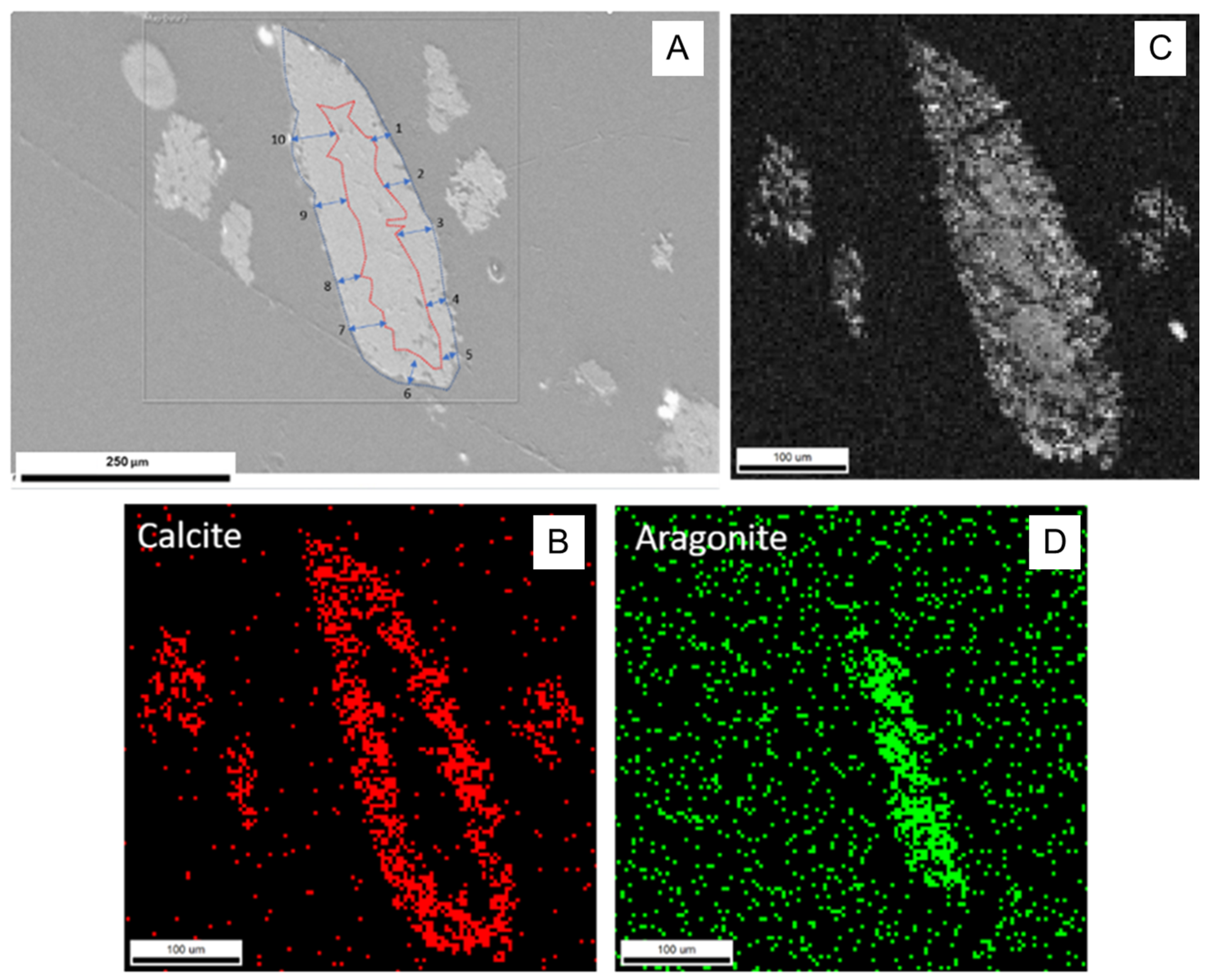 | A1 | 162 | 1152 | 8.3 | Red natural aragonite | Aragonite core with calcite rim, EBSD |