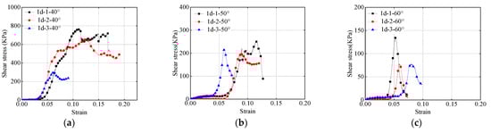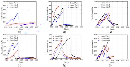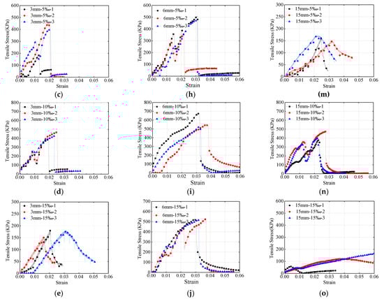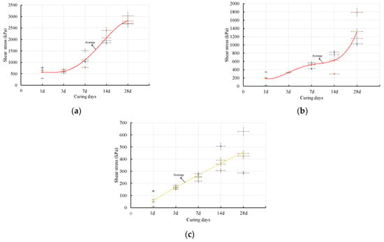 - The tensile and shear strengths of the shotcrete materials varied significantly after their doping by glass fibers with different lengths and different mix ratios. At the doped glass fibers’ length of 3 mm, the highest tensile strength of 429 kPa was reached at a mix ratio of 10‰, exceeding that of a 1‰ mix ratio by 175%. Similarly, at the doped glass fibers’ lengths of 6 and 15 mm, the peak tensile strengths of the shotcrete material were 585 and 417 kPa, respectively. These were higher than the lowest peak tensile strengths of the undoped shotcrete specimens by 37.3% and 309.8%, respectively. Moreover, at a shear angle of 50°, the mechanical performance of the fiber-doped shotcrete material increased continuously as the curing age increased. The shear strength increased most dramatically as the curing age increased from 14 to 28 d.