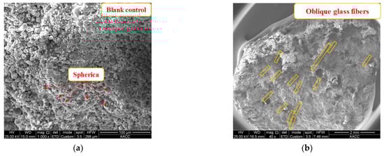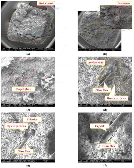 - The microstructure of the doped shotcrete specimens was observed by SEM. It was found that the doped glass fibers in the shotcrete specimens were intertwined with each other. The fly ash particles were embedded into the aeolian sand particles, partially filling the pores in shotcrete specimens. This microstructure was conducive to stress transfer within the specimens, improving the shotcrete specimens’ mechanical strength. The glass fibers were tightly enveloped by the shotcrete material particles, connecting the particles of different components into a whole, thus improving the mechanical strength of the shotcrete material.