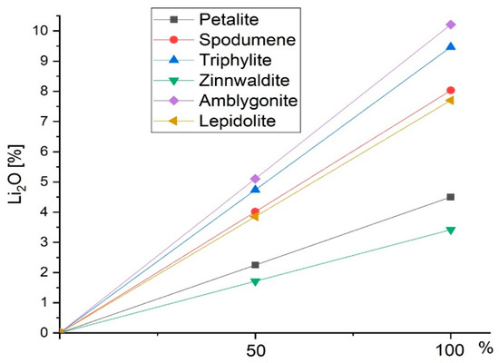 For these lithium minerals from definite occurrences, different calibration curves were set up and statistical methods were successfully introduced to determine the relevant lithium oxide content of these mixtures. The lithium content of these Li-minerals increases from Zinnwaldite, Petalite, Lepidolite, Spodumene, and Triphylite to Amblygonite/Montebrasite. It must also be taken into account that these minerals can form solid solutions which do influence these absolute lithium contents and must be adapted and determined separately [36]. In Figure 1 the theoretical calibration curves of the six lithium containing minerals, with ideal composition, showing their maximum lithium contents, are given. In practical work these curves with the lithium contents of the respective occurrence must be adapted due to the investigated mineral composition and ore compositions from different geological occurrences.
