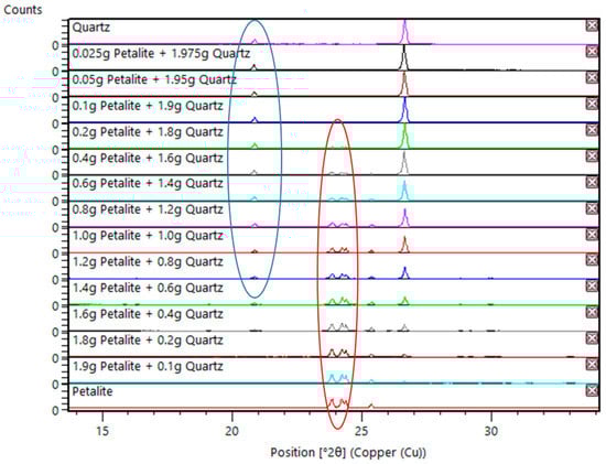 XRD patterns used for the calibration of petalite–quartz weight% mixtures (triplet of petalite peaks and main peak of quartz highlighted).