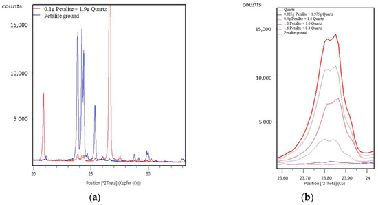 Determination limit of petalite in quartz matrix using main peaks of petalite. (a) Part of XRD pattern petalite and mixture of 95% quartz/5% Petalite; (b) Main peak of petalite in quartz matrices of different contents.
