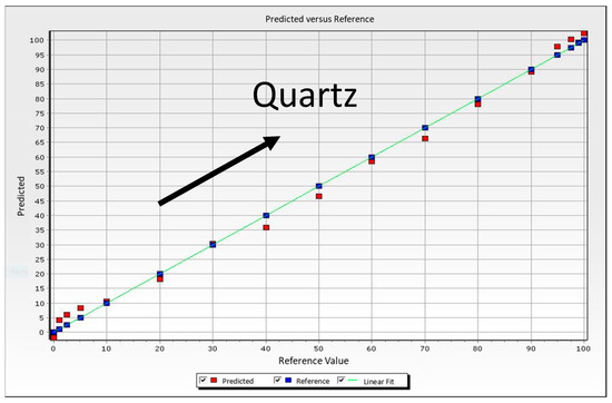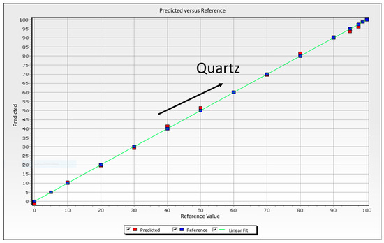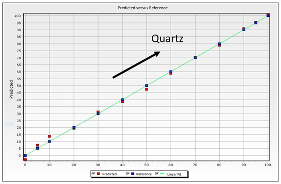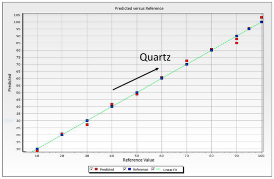 As spodumene is an important lithium mineral [32,44] some determinations on rather pure ores and concentrates were made. The results of the XRD calibration measurement of spodumene and quartz mixtures from Brazilian occurrence are summarized in Figure 7. The main peaks of spodumene and quartz are highlighted, to verify, that precise identifications of minerals can be made rather easily. The PLSR calibration curve for mixtures of spodumene and quartz is shown in Figure 8.