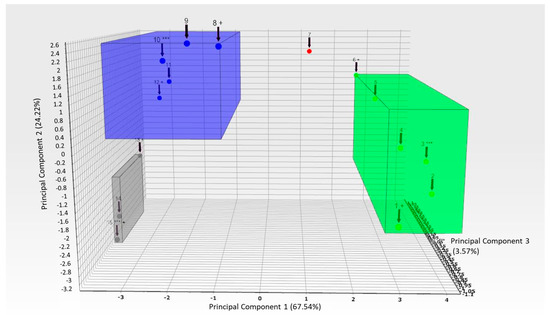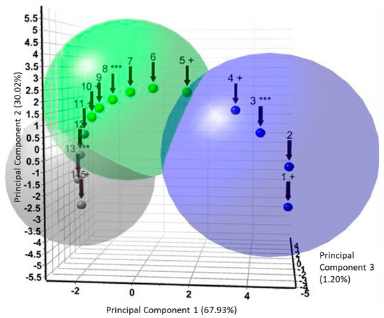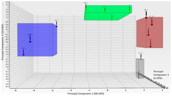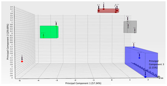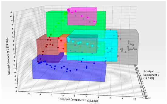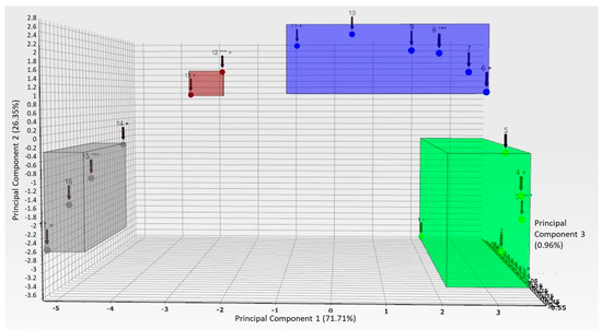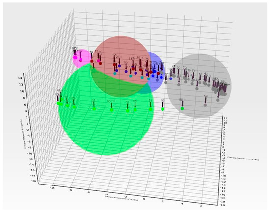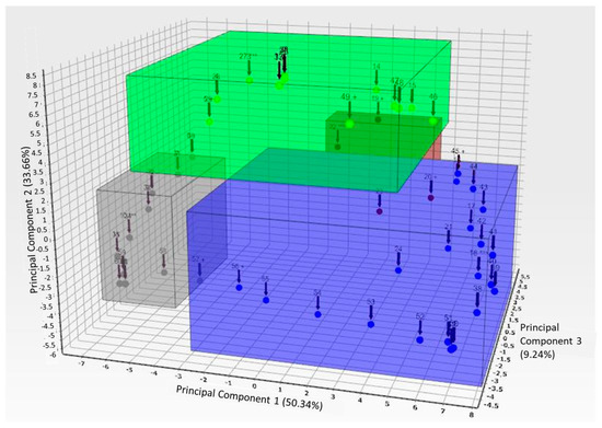 PCA plots [40,43] using the resulting eigenvectors, can create a three-dimensional arrangement of first three principal components and can show thereof the XRD data belonging to the different clusters.