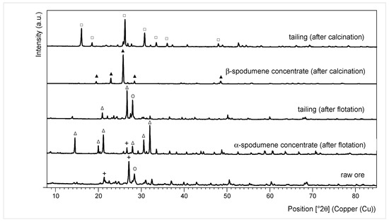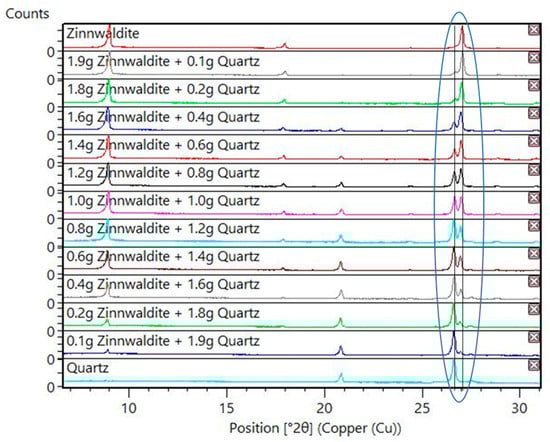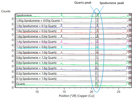 XRD patterns of different spodumene–quartz mixtures (main peak of quartz and spodumene highlighted).