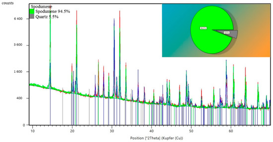 As an example for Rietveld refinement control of the different mixtures, the Rietveld plot for a mixture of 95% spodumene and 5% of quartz and the calculated composition is given in Figure 9.