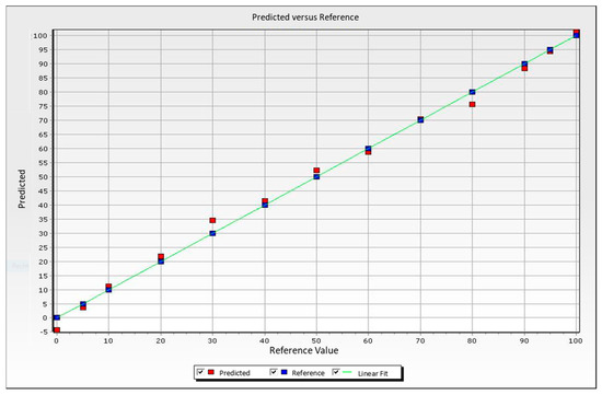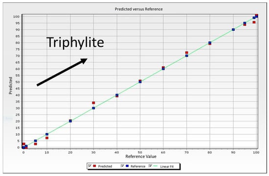 Investigations using Triphylite (LiFePO4) (Hagendorf/Bavaria) [36] ore must primarily deal with the possible solid solution with Lithiophorite (LiMnPO4). This composition for the geological occurrence is definitely used for making the calibration curves. Figure 11 shows the PLSR calibration curve for triphylite–quartz mixtures for a typical Hagendorf lithium ore.