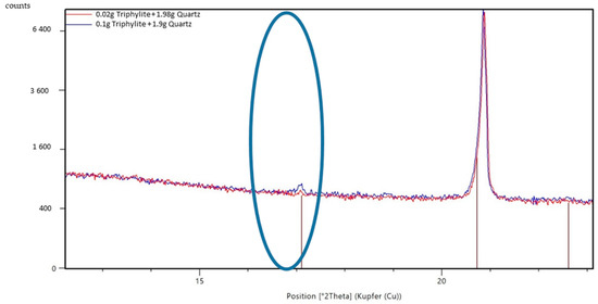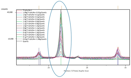 The graphical way to determine detection limits of triphylite is given in Figure 15 by showing the relevant XRD patterns of quartz–triphylite mixtures. 1% of triphylite in a quartz matrix can easily be determined in these mineral mixtures.