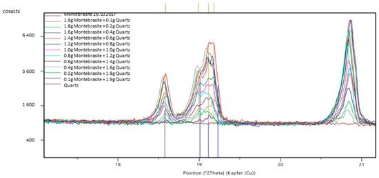 For the determination of different montebrasite (F-containing) contents from NE-Brazil in the mixtures with quartz a calibration curve using PLSR was set up. The derivation of this method must also include the solid solution of the minerals montebrasite and Amblygonite [45]. The XRD patterns of montebrasite/quartz mixtures are shown in Figure 16 and the PLSR calibration curve for montebrasite is given in Figure 17.