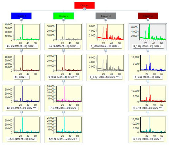 Clustering of triphylite–quartz mixtures showing four different lithium ore grades. *** most representative Scheme 2. contents, low triphylite, medium triphylite, and high triphylite contents. The XRD patterns of these mixtures and their calculated groups, including their similarities, are given in Figure 13. To show the relevant main peaks of the mineral quartz in these mixtures, with special emphasis to low amounts, Figure 14 is added.