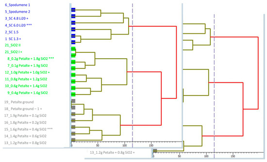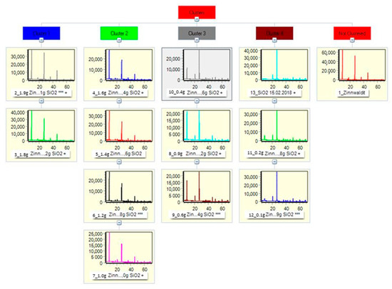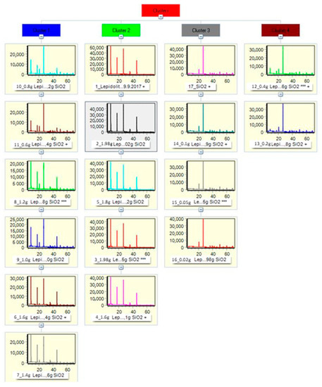 Cluster analysis is a statistical method [2,40,41,42] which can be used for obtaining rapid results in ore assessment by finding similar groups (clusters) which are more similar to each other than to those of other groups. The technique is mainly used for data reduction. It is applied here to find clusters containing similar grades of lithium contents in the ores (high, intermediate, and low grade) to obtain arguments for further ore treatment. Within this method additional possibilities can be used for further optimizations (PCA (principal component analysis), dendrogram, KGS (Kelley, Gardner, Sutcliffe) test and others). The dendrogram is a possibility to define different clusters using the cut off between less similar XRD patterns. Mainly, cluster analysis is used for data reduction of complex systems.