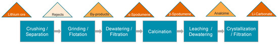 - Dessemond, C.; Lajioe-Leroux, F.; Soucy, G.; Laroche, N.; Magnan, J.-F. Spodumene—The lithium market, resources and processes. Minerals 2019, 9, 334. [Google Scholar] [CrossRef] [Green Version]