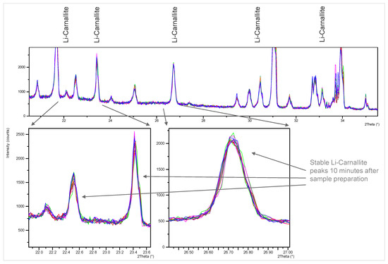The case study demonstrates that XRD can be used to monitor different salts of lithium brines. Special sample preparation is required due to the hygroscopic of the lithium salts. Cluster analysis is a fast method to identify different mineralogical compositions of the salts. Due to measurement times of about 5 min and quantification of the total mineral content (crystalline phases) it is possible to use XRD as process control method to monitor the mining and processing of lithium brines.