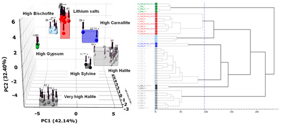 Cluster analysis identifying different clusters of evaporites from a lithium brine deposit (n-43) and the relevant dendrogram, *** indicates the most representative scan of a cluster, + indicates the two most different scans within one cluster.