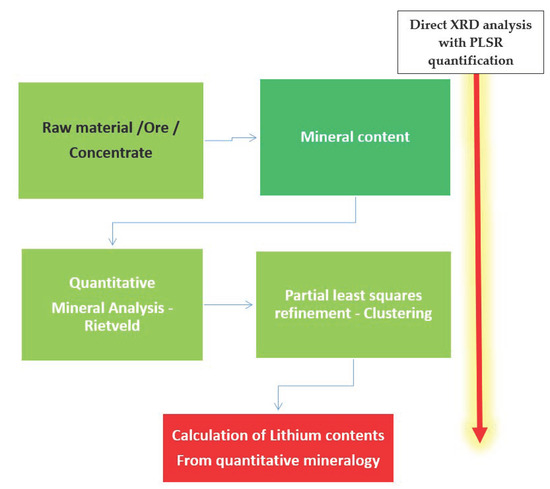 The procedures followed in this type of analysis, using primarily the quantitative mineral content and performing a recalculation of the lithium content in these minerals, can be used on the different raw materials. A short description is given schematically in Figure 45.