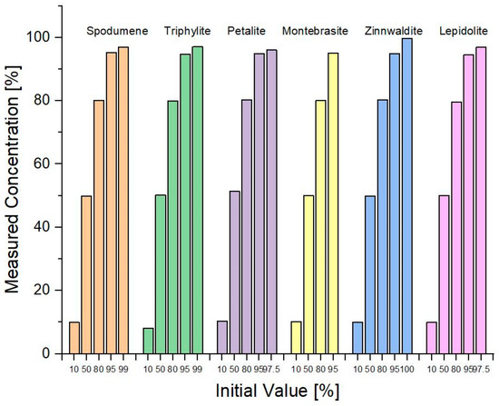 The minimal detection of minerals in the relevant matrices is the basic fact that must be done to see what is the lowest lithium concentration which can be detected. Despite these low concentrations not being as interesting as lithium ores, these mixtures can be classified in the different group of low content lithium ore or otherwise a different fourth grade can be added, meaning low lithium contents without any interest for lithium extraction. The lowest lithium concentration which can be measured is dependent on the possibility of identifying the lithium mineral in the matrix and is given for any lithium mineral used in this study.