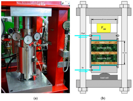 The MiniSandwich specimens consisted of three ES sandwiched by two DS of blended bentonite (Figure 1b), separated by filter papers (manufacturer: Macherey-Nagel, material: cellulose, pore size: 7.0–12.0 µm). The diameter of the columns was 90 mm and a total sample height of 125 mm was envisaged. Actual sample heights of 130 and 131 mm, respectively, were obtained (Table 3). Sample heights decreased to 129.2 and 129.8 mm, respectively, by applying the axial load prior to the start of the hydration.