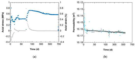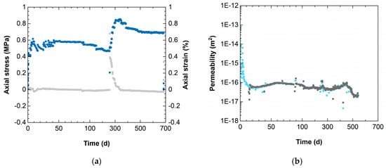 Accurate determination of swelling pressures under consideration of the heterogeneity of the MiniSandwich setup with different material segments is a challenge, because the axial effect of swelling DS is partly compensated by compacting the sand in ES. However, the selected experimental MiniSandwich setup corresponds to the arrangement used in real shaft conditions, which facilitates a realistic upscaling. As already mentioned, the measured axial stress necessary to ensure volume constancy during the test corresponds to the swelling pressure of the whole sandwich. Thereby, it is worth to noting that the applied maximum hydraulic pressure to ensure saturation over the experimental time is about half of the maximum swelling pressure of the MiniSandwich (swelling pressure for cell 9: 0.7 MPa; for cell 10: 0.6 MPa). Only in the beginning of the experiment was a stepwise increase of the axial strain required to ensure the water access to the material (Figure 2a and Figure 3a). In the later state of the experiments, the axial load remained nearly constant, which indicated that stationary conditions for swelling and fluid flow were reached.