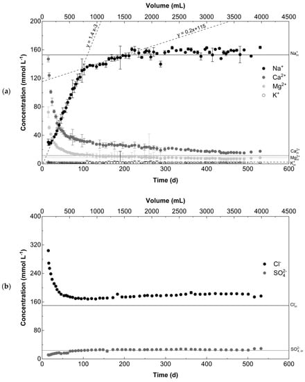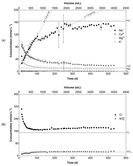 Sodium concentration in the outflow of both cells increased with a steep linear slope during the first 100 days. Afterwards, the Na concentration increased further with a linear but less steep slope up to 200 days (cell 9) and 300 days (cell 10), respectively, until it reached a nearly constant value of about 157 and 150 mmol/L (Figure 4 and Figure 5) corresponding to the inflow concentration. For cell 10 a slight decrease in Na concentration was observed around day 100 and 300 of the experiment at the beginning of each change in slope of outflow concentration (Figure 5). The concentration of Ca, Mg and K decreased potentially (x−1/2) approaching asymptotically a concentration close to the concentration of each cation in the inflow Pearson water (Figure 4 and Figure 5). Thereby the calcium concentration was 16 and 20 mmol/L for cell 9 and 10, respectively, and thus slightly higher than 11.6 mmol/L in the inflow. The asymptotic concentrations of Mg and K were 7.2/8.7 mmol/L and 1.6/1.5 mmol/L, respectively, for cell 9 and 10.