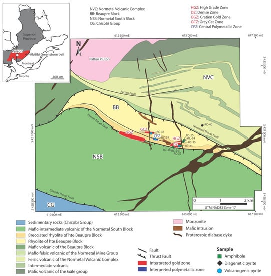 Geological map of the Perron gold project. Note the Beaupré rhyolite dome lying directly above the Western Caldera. Samples used for this study, outside of the HGZ are projected vertically. Star for location of the Perron deposit in the inset. Figure modified from [14] and AMEX Exploration.