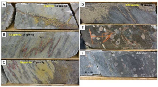 The Central Polymetallic Zone (Figure 1) is a typical example of volcanogenic gold-bearing mineralization. The zone is devoid of quartz veining but rich in sulfide occurring as stringer of chalcopyrite, sphalerite, pyrite, pyrrhotite (Figure 2A), and locally galena and transposed along the schistosity (Figure 2B,C). Disseminated sulfides also occur within brecciated rhyolite. Sericite and chlorite define the hydrothermal alteration envelope (Figure 2A–C). Silver values are typically ~10 times higher than gold (Amex internal data; Figure 2A–C). Higher gold grades are related to higher sulfide contents and are correlative either with zinc or copper values. This zone is interpreted as a discordant linear volcanogenic hydrothermal feeder.