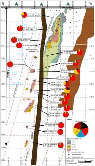 The Perron project comprises four different vein-type gold-bearing zones (high-grade zone (HGZ), Denise, Gratien, and Grey Cat) along an E-trending 3.2-km-long corridor (Figure 1). The focus of this study is limited to the HGZ, which is the richest gold zone. This steeply north-dipping zone (Figure 3) is traced by drilling over 350 m laterally, from near-surface to >1.2 km vertically along a 75° eastern plunge with an average of ~7 m of width (core length) and a true thickness of 3 to 4 m. From the longitudinal view, the gold mineralization is very continuous, with a central high-grade core with metal factor >100 (gold grade in ppm * thickness in meter) bordered by lower grade gold mineralization (Figure 3).