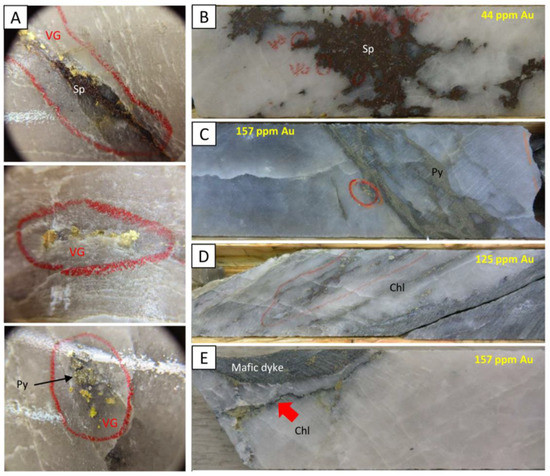 The HGZ corresponds to massive, whitish to greyish quartz veins with traces of iron carbonates, green chlorite, and tourmaline. Visible gold grains occur, in order of predominance (Figure 4A): (1) associated with sphalerite; (2) along chlorite ribbons and flakes; and (3) freely in quartz. Brown sphalerite, reaching >5% locally is ubiquitous in the veins (Figure 4A,B) as well as pyrite (<2%: Figure 4A,C). Sphalerite texture varies from massive aggregate (<3 cm) to trails of disseminated grains (Figure 4B) whereas pyrite commonly occurs as millimetric parallel bands (Figure 4C). Distorted ribbons of chloritized and pyritized host rocks are common near the contacts (Figure 4D). The HGZ is developed at the interface of a deformed mafic dyke, which acted as a planar anisotropy for shearing. Veins occur either along one side or the other or along both sides of the dyke and occasionally within the dyke, especially at depth. A fundamental observation is that the quartz veins were formed by dilatation within the shear zone (Figure 4E). Genetically, they are not shear veins [17]. Their origin in extension is manifested by ribbons of host rocks indicating sequential crack-seal openings of already schistose mafic dyke and rhyolite, without evidence of displacement along the ribbons (Figure 4D,E). Hydrothermal alteration is very weak, even within mafic dykes. It is manifested by chloritization of mafic dykes with the local presence of leucoxene and weak sericite alteration of rhyolites. Other gold-bearing zones have similar characteristics.