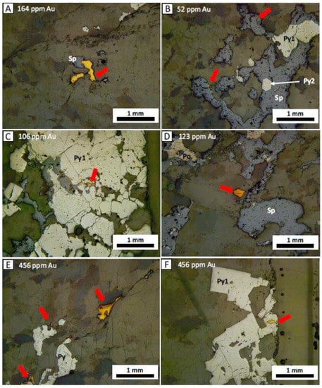 Photomicrographs of the sulfide mineralogy and texture, and visible gold habit in the HGZ quartz veins. Gold assays are given in ppm for reference. (A) Gold (red arrow) in quartz in contact with sphalerite (Sp), sample RC-09. (B) Gold in association with sphalerite, note the difference between pyrite Py1 (subhedral) and Py2 (pentagonal dodecahedron) in sphalerite, sample RC-19. (C) Gold associated with sphalerite cutting across pyrite Py1, sample RC-14. (D) Gold in quartz with a spatial association to sphalerite, note the pyrrhotite (Po) associated sphalerite, sample RC-16. (E) Gold in quartz occurring along a fracture with gold in contact with pyrite, sample RC-12. (F) Gold as inclusion in pyrite Py1, sample RC-12.